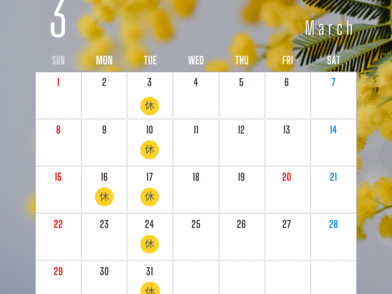 いつもお世話になり本当にありがとうございます 3月の営業&お休み日のお知らせです 3.10.16.17.24.31日です(火曜日 16日月曜日 お休み) どうぞよろしくお願い申し上げます 営業時間 1 …