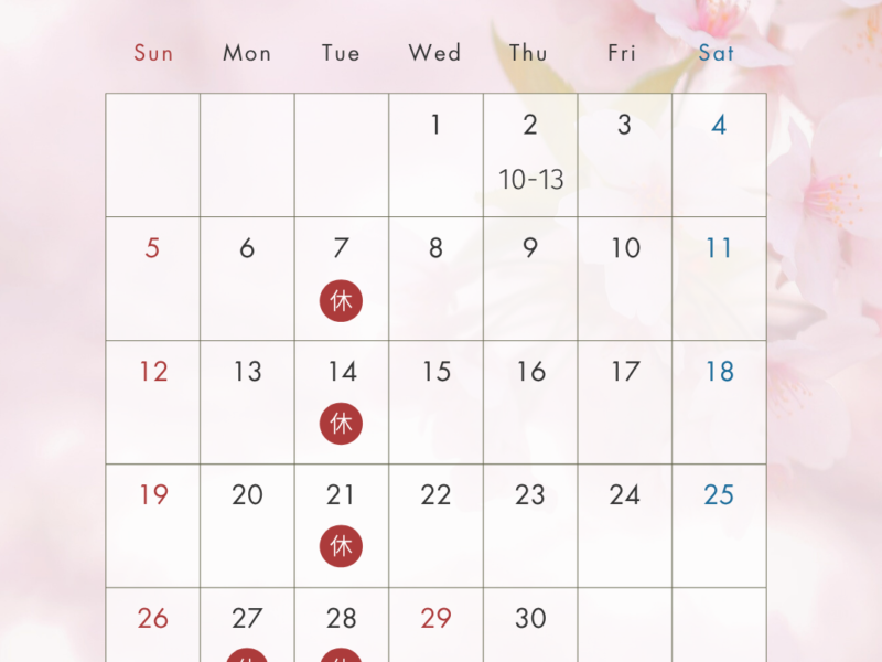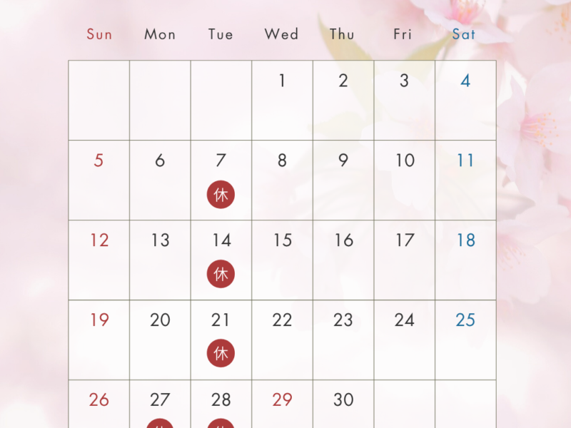 いつもお世話になり本当にありがとうございます 4月の営業&お休み日のお知らせです 7.14.21.27.28日です(火曜日 27日月曜日 お休み) どうぞよろしくお願い申し上げます 営業時間 10:0 …